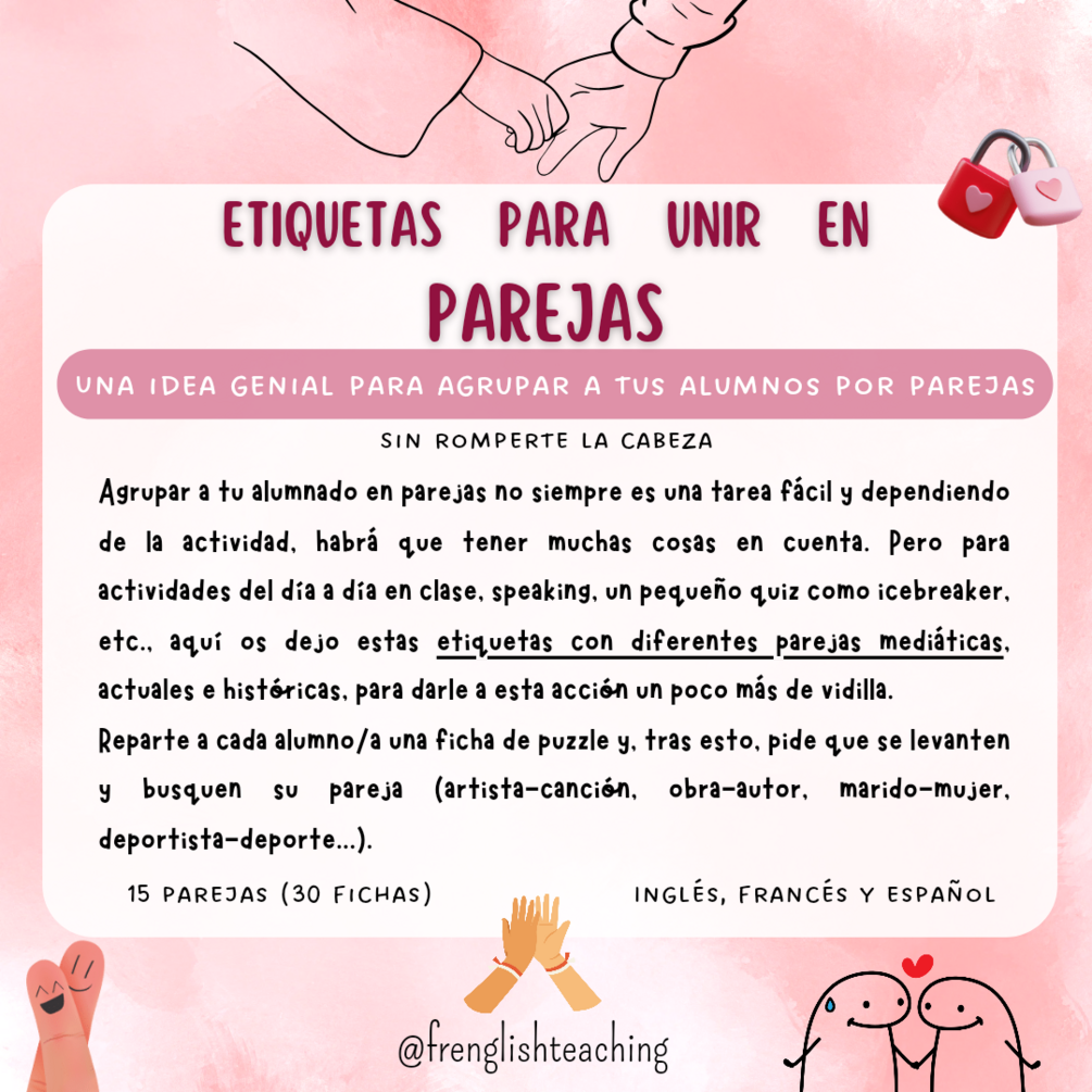 30 etiquetas en diferentes idiomas para conseguir agrupar a 15 parejas. Repártelas entre tus alumnos/as y pide que unan al autor con su obra, al cantante con su canción, al deportista con su deporte o a la pareja sentimental. Parejas históricas y actuales.
